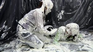 OLの2人が初めてのパイ投げ合戦。シャッキっとしたOLスーツがどんどんパイまみれに。やがて全身真っ白に。ラストはお互い大量のパイを上からかけられグチョグチョ。