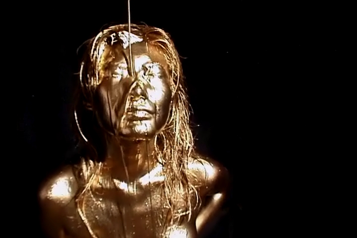 シリーズで最も人気のある作品です! 空中に金粉末を乱舞させてオイルを塗った身体に付着させて金色に染めていくというアイデアが秀逸。金粉がダイヤモンドダストのように煌く幻想的な黄金世界。最後には目の中も金色に染まってしまう!究極の金粉作品!
